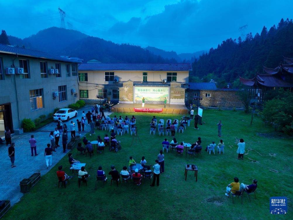 7月17日,在海拔1200米的周宁县浦源镇紫云村,游客在观看前来暑期社会实践的大学生表演“村晚”节目(无人机照片)。