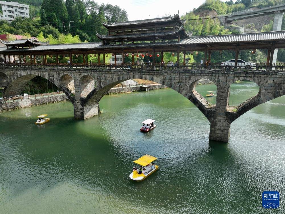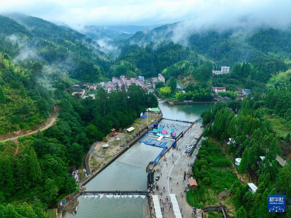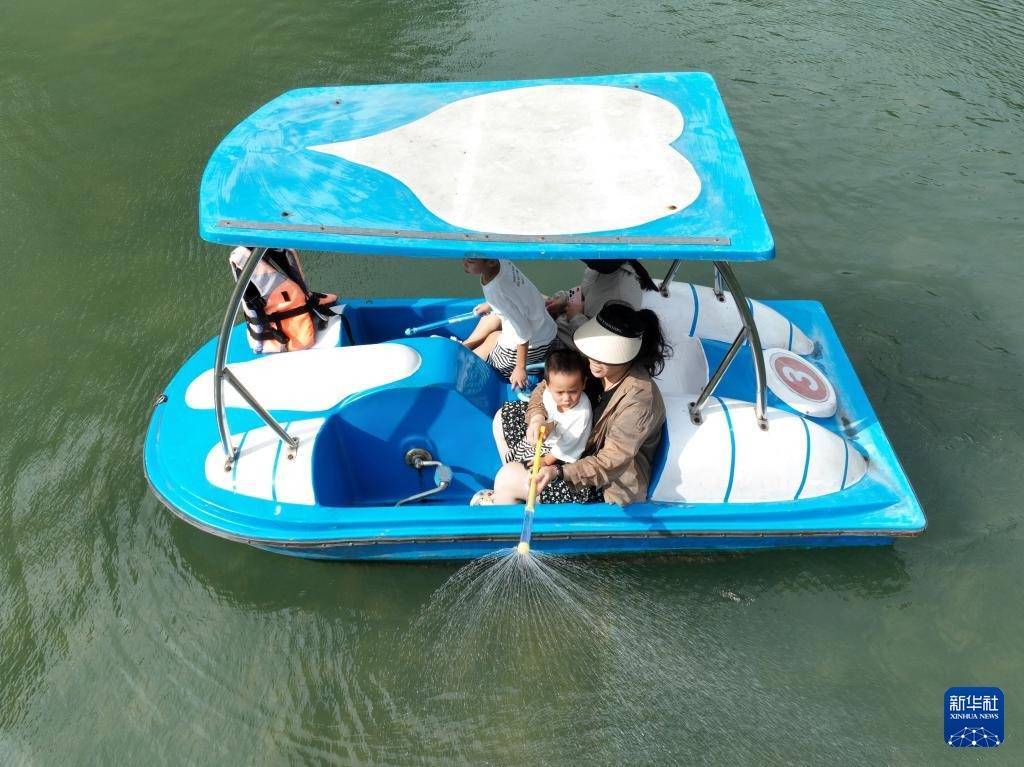 7月18日,游客在周宁县泗桥乡溪口村乘船游玩(无人机照片)。