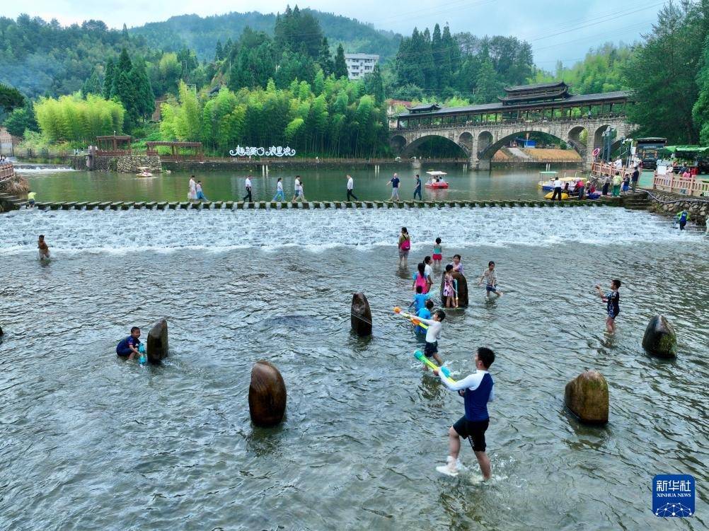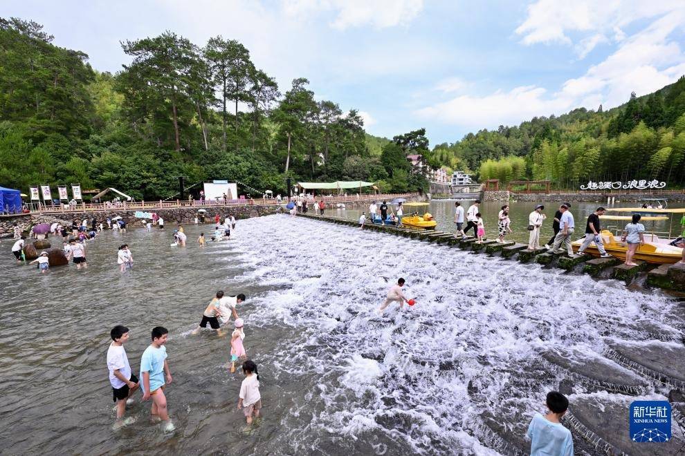 7月18日,游客在周宁县泗桥乡溪口村戏水度夏。