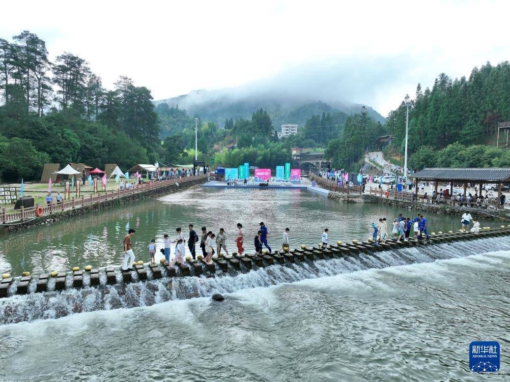7月18日,游客在周宁县泗桥乡溪口村参观游玩(无人机照片)。