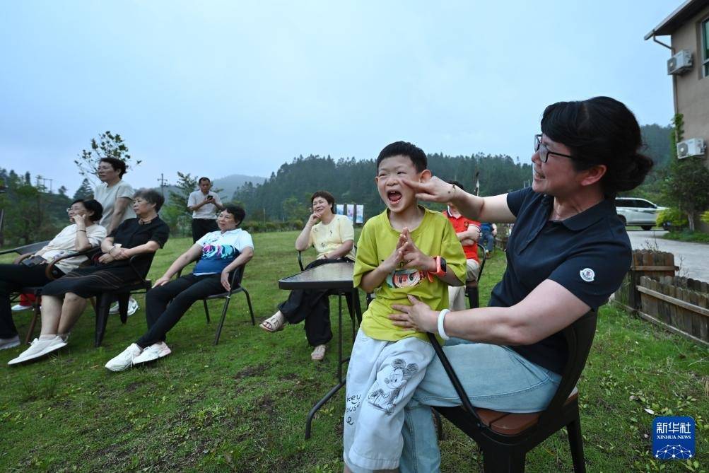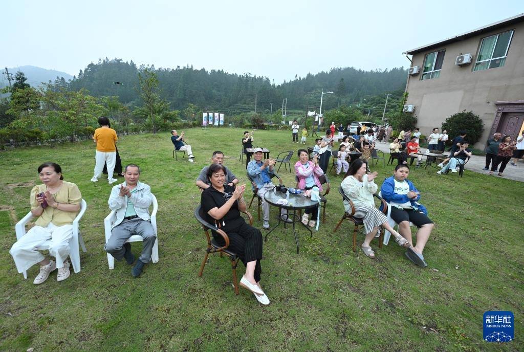 7月17日,在海拔1200米的周宁县浦源镇紫云村,消暑休闲的游客在草坪上观看表演。