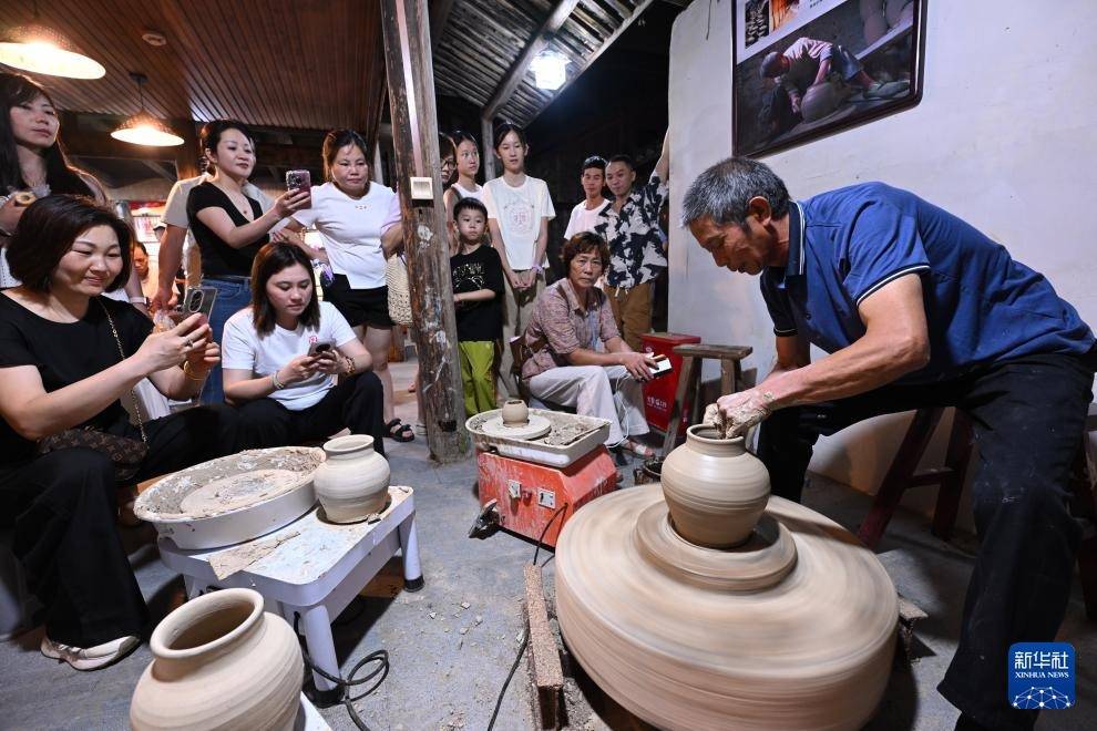 7月17日,在周宁县浦源镇鲤鱼溪景区民俗馆,游客在观看传统制硋拉胚表演。